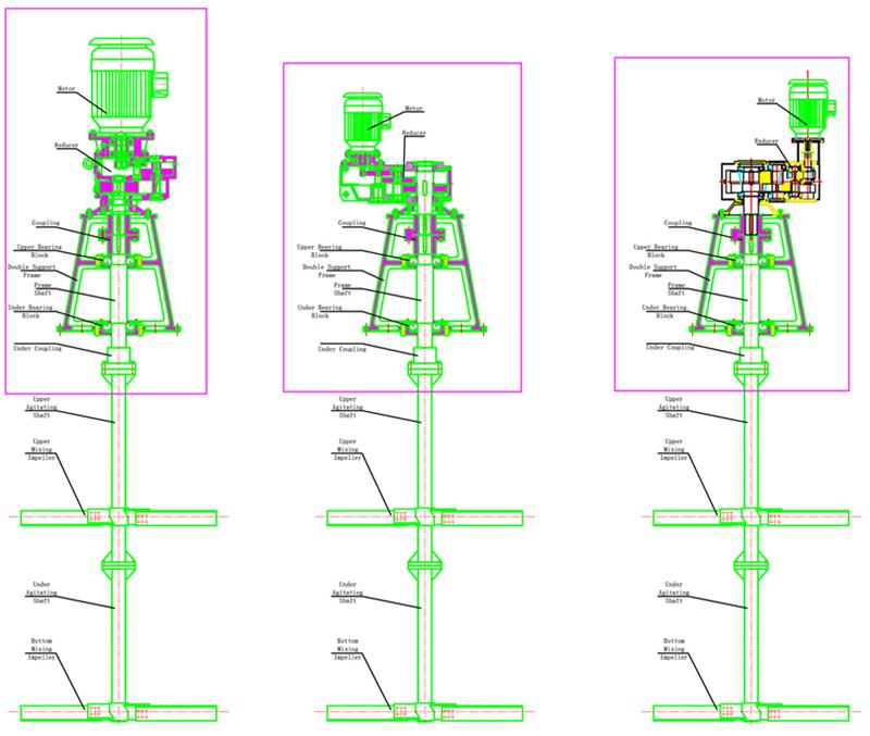 1) Forme d'installation d'agitation centrale verticale Elle est caractérisée en ce que l'arbre de l'agitateur et l'agitateur sont disposés sur la ligne centrale du réservoir d'agitation et sont disposés symétriquement.Le mode de conduite est une transmission par courroie ou une transmission par engrenages ou par transmission à décélération, et est également directement entraîné par le moteur.La puissance de l'équipement de mélange peut varier de 0,1 kW à des centaines de kilowatts, et la plage de puissance habituelle est de 0,2 à 22 kW.Généralement, la puissance est inférieure à 3,7 kW pour une petite taille, de 5,5 à 22 kW pour une taille moyenne et supérieure à 22 kW pour une grande taille.Les petits mélangeurs sont utilisés dans l'industrie alimentaire.Le type à basse vitesse est inférieur à 100r/min, le type à vitesse moyenne est de 100~400r/mm et le type à grande vitesse est supérieur à 400r/mn.Selon l'application, la structure de la pale peut être combinée de diverses manières, avec une hélice de type tripale.La turbine est le corps principal et peut être combinée dans une variété de formes structurelles pour s'adapter à une variété d'utilisations.La plupart de ces équipements de mélange ont été standardisés dans les pays étrangers.La plage de vitesse est de 300 à 360 tr/min et la puissance du moteur est de 0,4 à 15 kW.Il est entraîné par un premier étage de décélération avec entraînement par courroie ou transmission par engrenages.